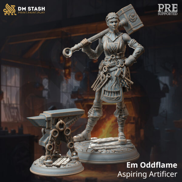 Em Oddflame to postać łącząca energię młodości z potęgą inżynierii magii. Model zachwyca detalami: od potężnego młota spoczywającego na ramieniu, po kowadło i liczne narzędzia u jej boku. To idealna figurka dla gracza szukającego Artificera lub wynalazcy o unikalnym, warsztatowym designie, który wyróżni się na każdym polu bitwy.