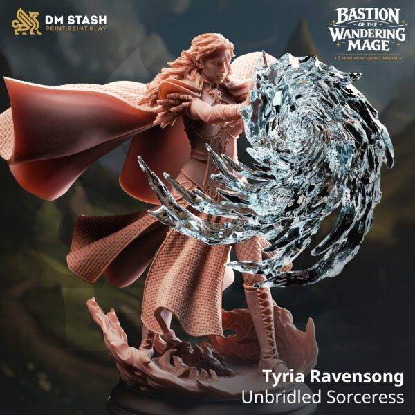 Tyria to potężna czarodziejka, która w pełni okiełznała niszczycielskie siły żywiołów, stając się żywym ucieleśnieniem magicznej furii. Jej postawa emanuje pewnością siebie i surową mocą, sprawiając, że na polu bitwy Tyria jawi się jako niepowstrzymany żywioł, przed którym nie ma ucieczki.