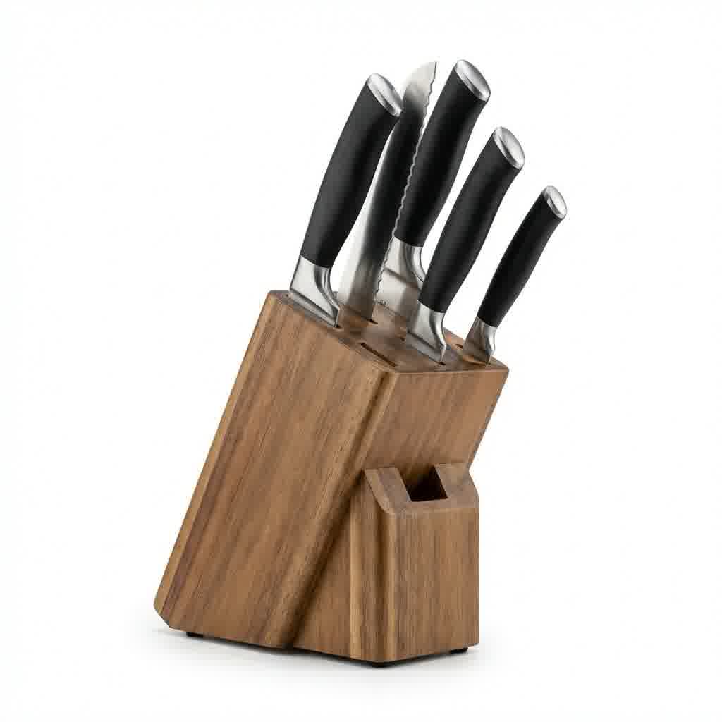 Ostrza wykonane z niemieckiej stali nierdzewnej X50CrMoV15 o twardości 58 HRC. Ergonomiczne rękojeści z ABS zapewniają pewny chwyt nawet mokrymi dłońmi. Blok z naturalnego drewna akacjowego pasuje do każdej kuchni.